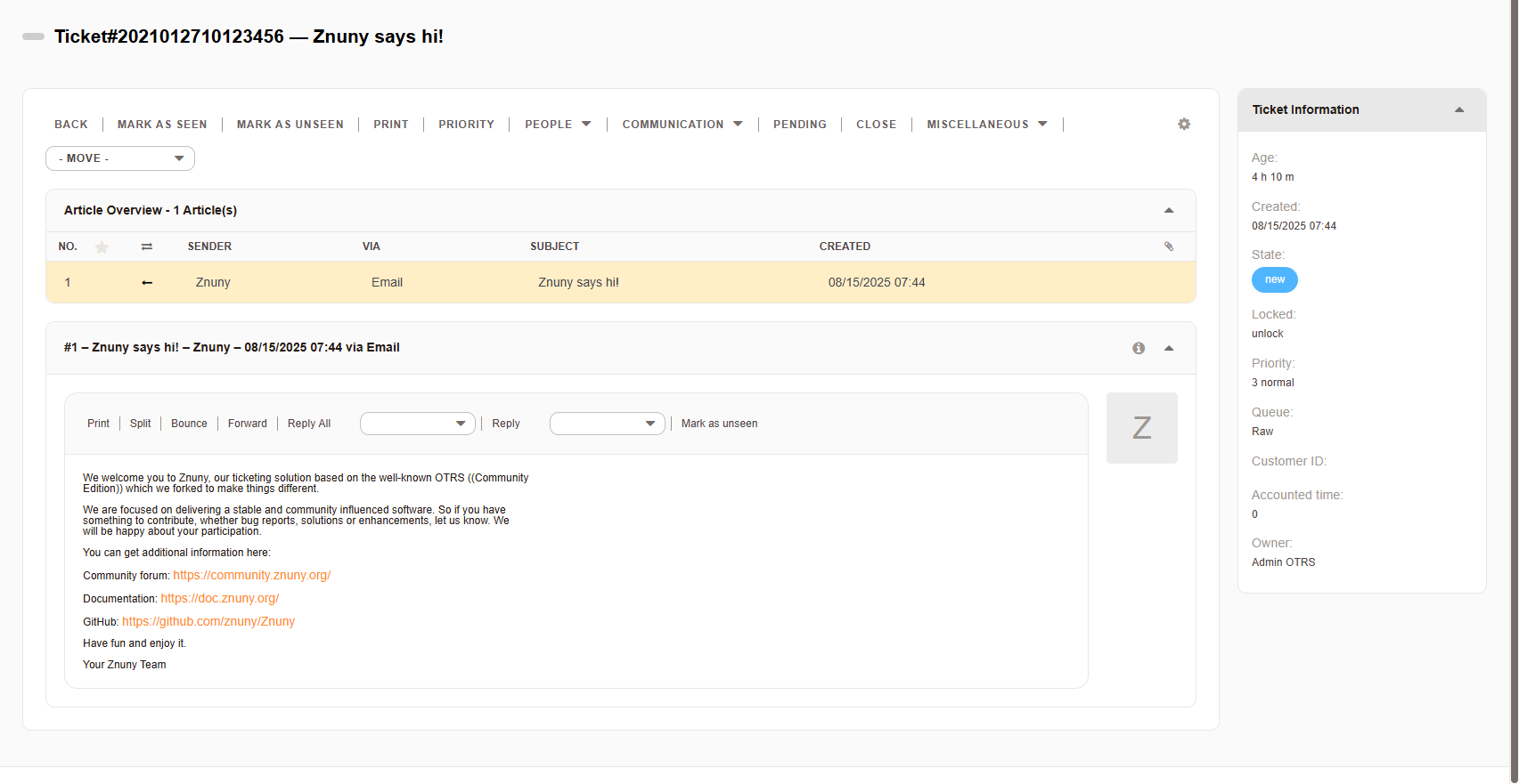 In Znuny, the Details View (as shown in your screenshot) is the main working area for a single ticket. It’s split into three main zones, each with a specific function: