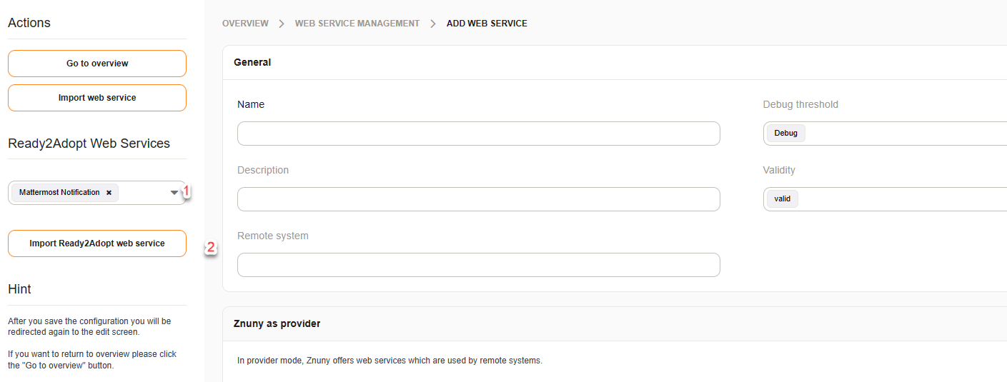 Select Mattermost notification and click on the button below to import the predefined web service.