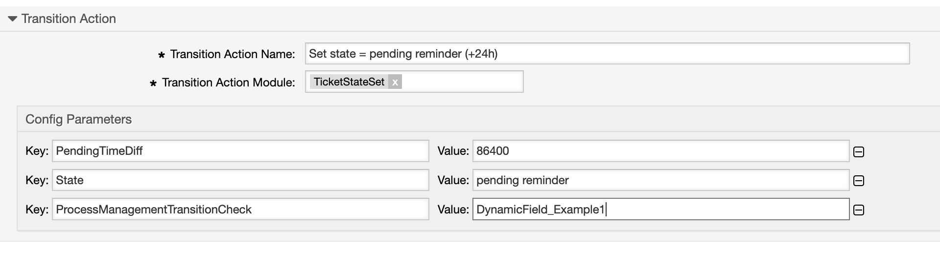 With the parameters ForeignTicketID or ForeignTicketNumber, it is possible to execute a transition action module on behalf of another ticket.