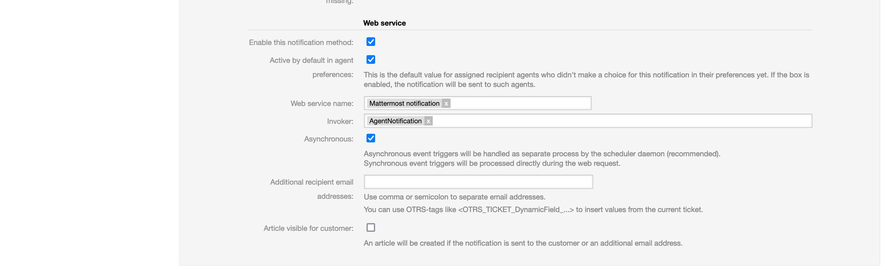 By adding the new created web service to an existing notification we finalize this example. Open the existing ticket notification Ticket create notification and scroll down block Web Service of the section Notification Methods. Select your web service and the invoker, check asynchronous and save your changes: