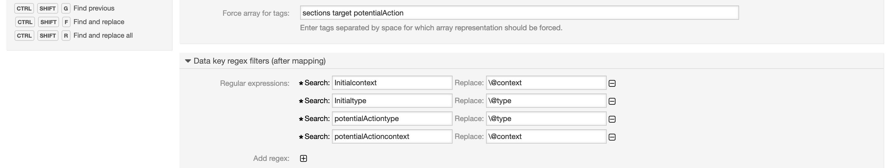 The XML elements sections, target and potentialAction (line 10, 17, 21) are configured to be converted to an array with the setting Force array for tags.