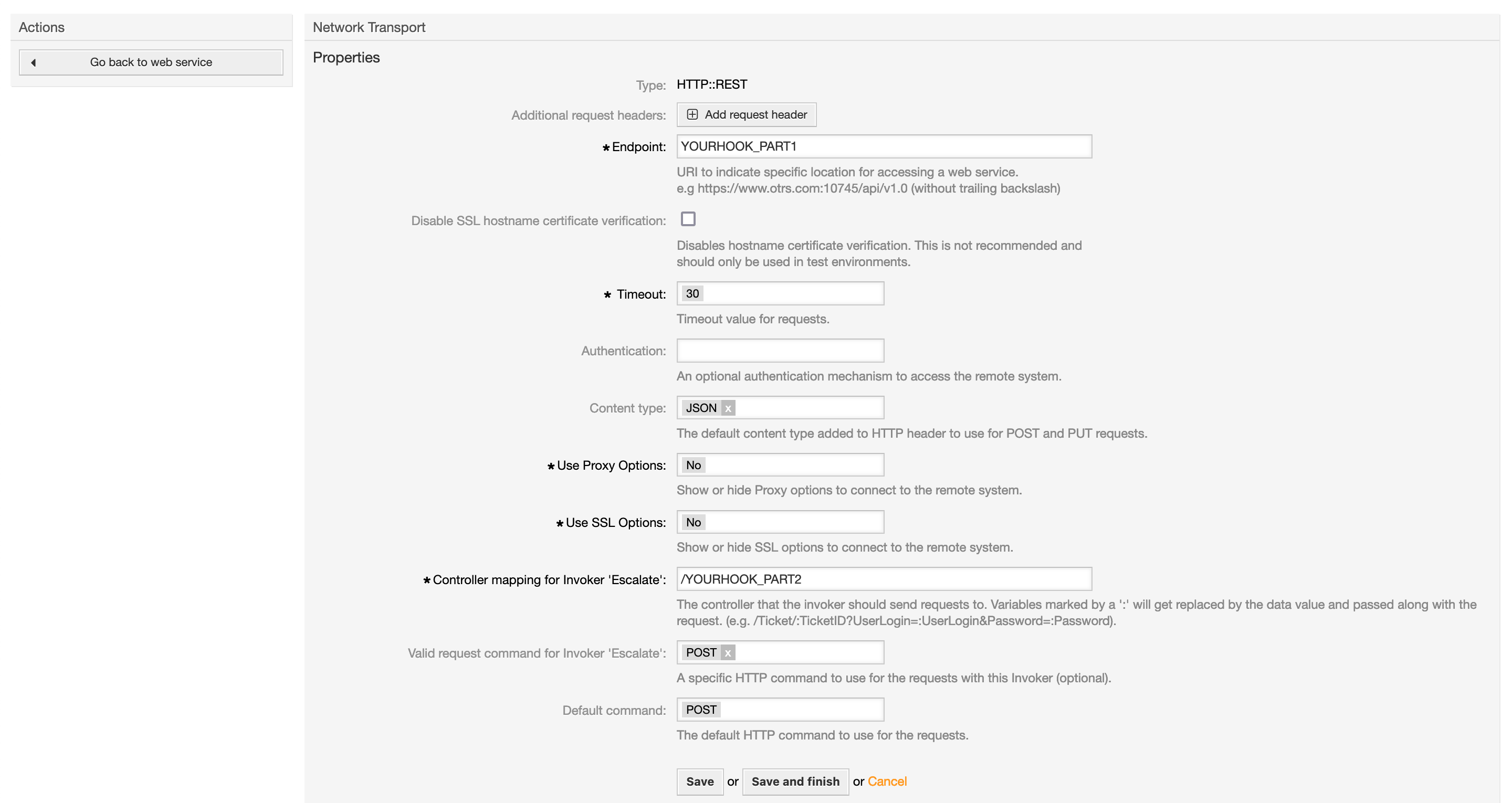 Replace YOURHOOK_PART1 in the setting Endpoint with first part of the splitted webhook and YOURHOOK_PART2 with the second part. Both parts together must be equal to the generated webhook.